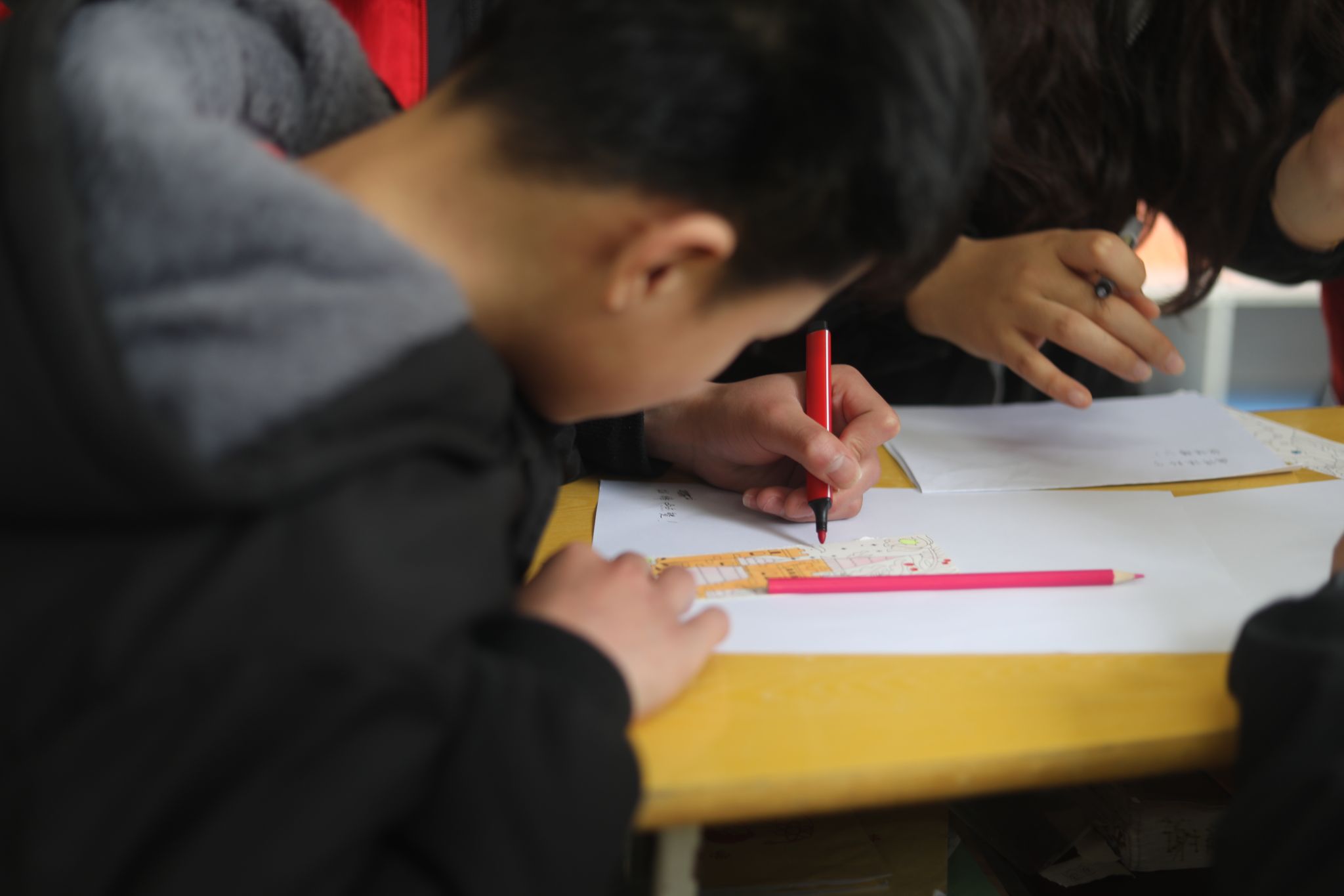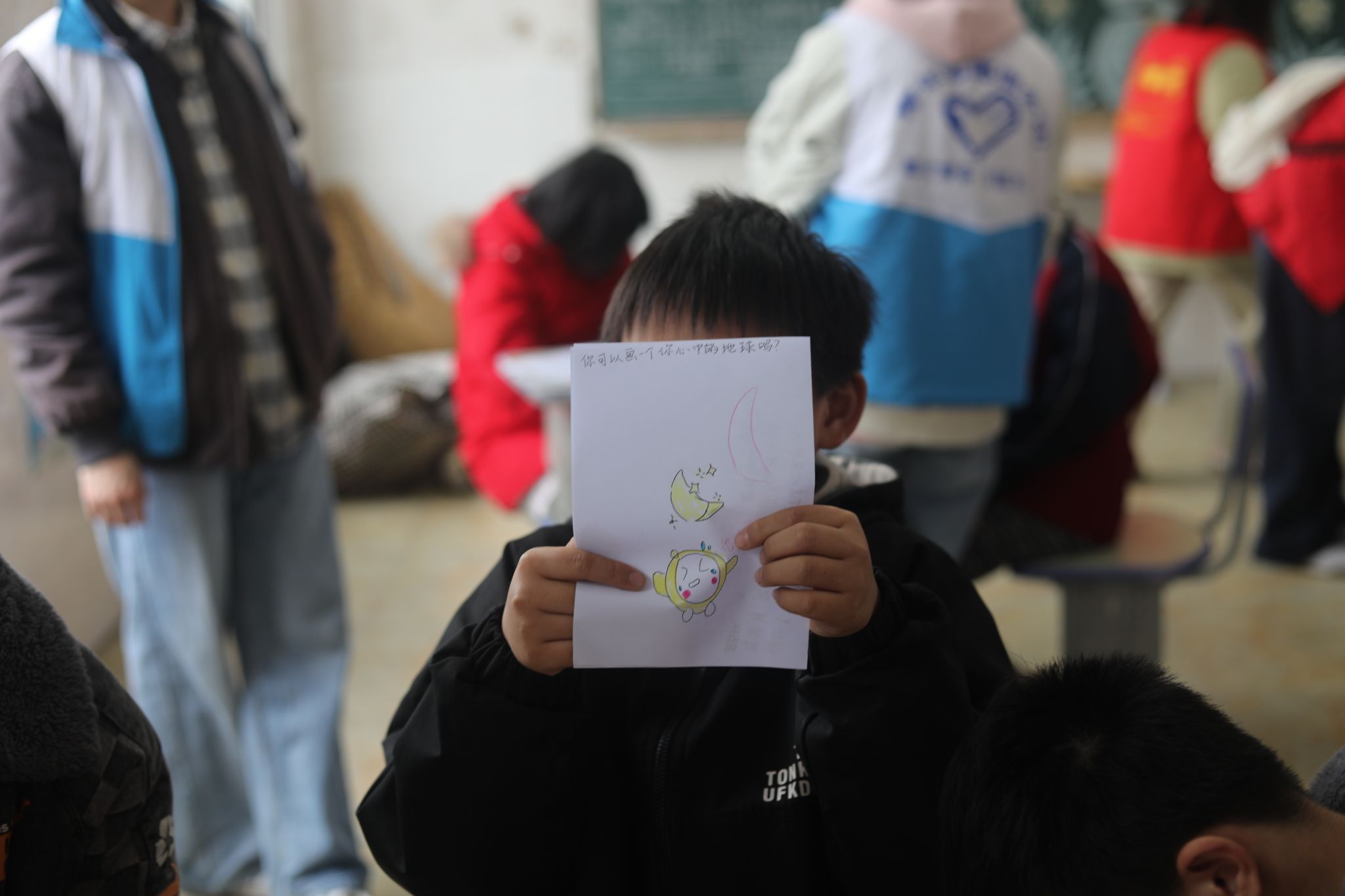 活动现场,志愿者们与听障儿童围坐成圈,用彩笔共同描绘"心中的地球"。孩子们在志愿者的引导下,以斑斓色彩勾勒出充满童趣的星球。一幅幅画作不仅展现了孩子们天马行空的想象力,更架起了心与心沟通的桥梁。“看到孩子指着画纸兴奋地用手语比划‘我的地球有会飞的房子’时,我真正感受到艺术的力量。”志愿者李素珍感慨道。