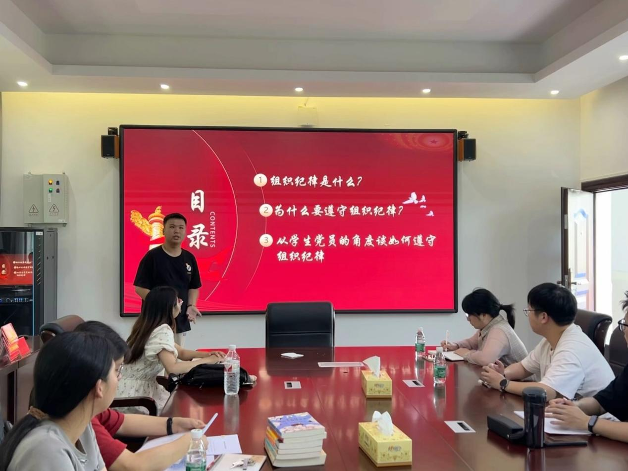 学生党员杨子易从组织纪律“是什么、为什么要遵守、如何遵守”三个方面切入,让党员同志意识到,要时刻把自己置于党组织之下,相信组织、依靠组织、服从组织,维护集体领导;学生党员夏思敏结合典型案例从四个方面细致讲解了群众纪律的要点,强调作为党员要始终强化宗旨意识,坚持把让人民满意作为一切工作的出发点和落脚点。