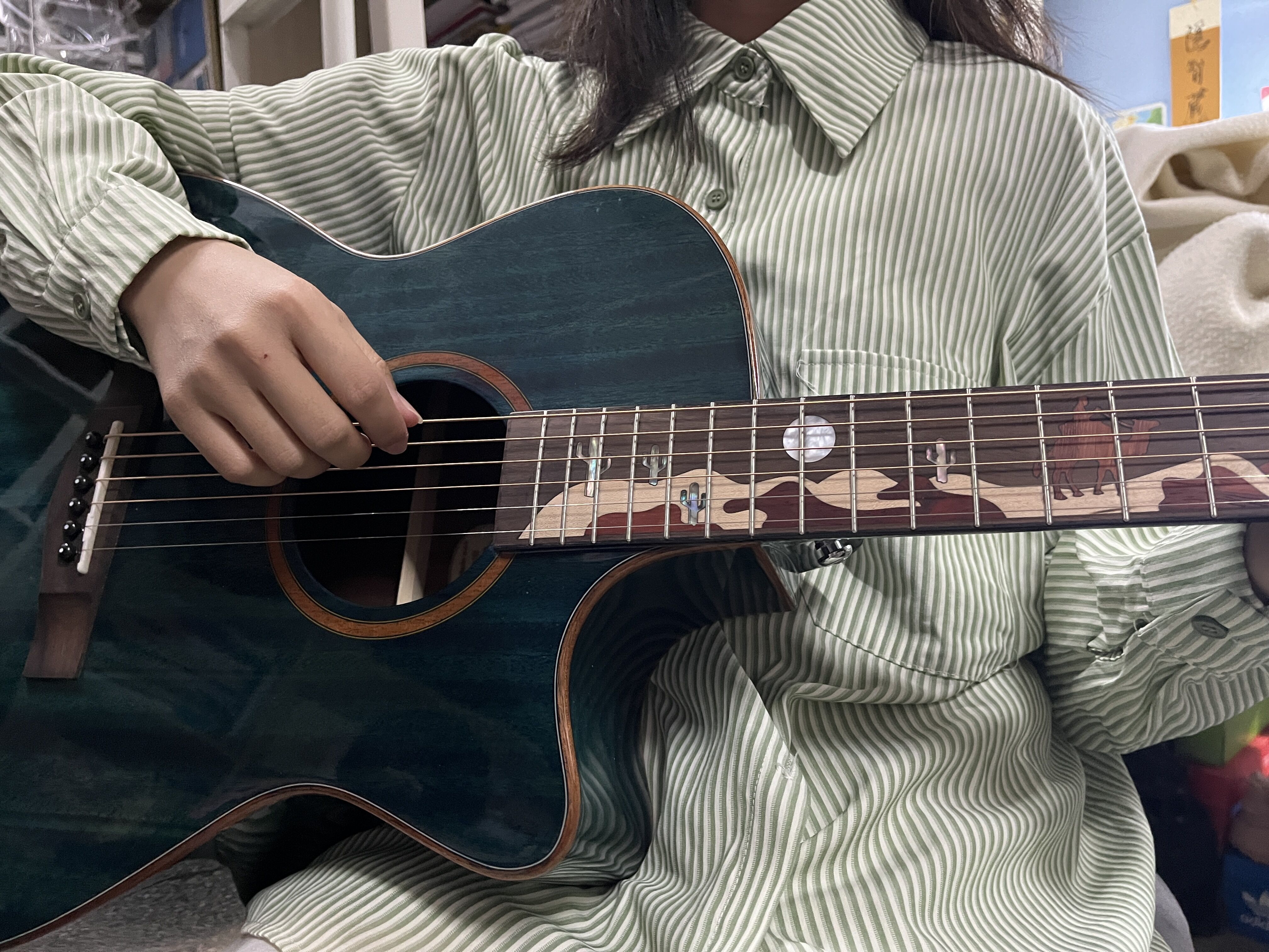 (图为思政2102班欧阳岚在课后进行吉他弹奏)