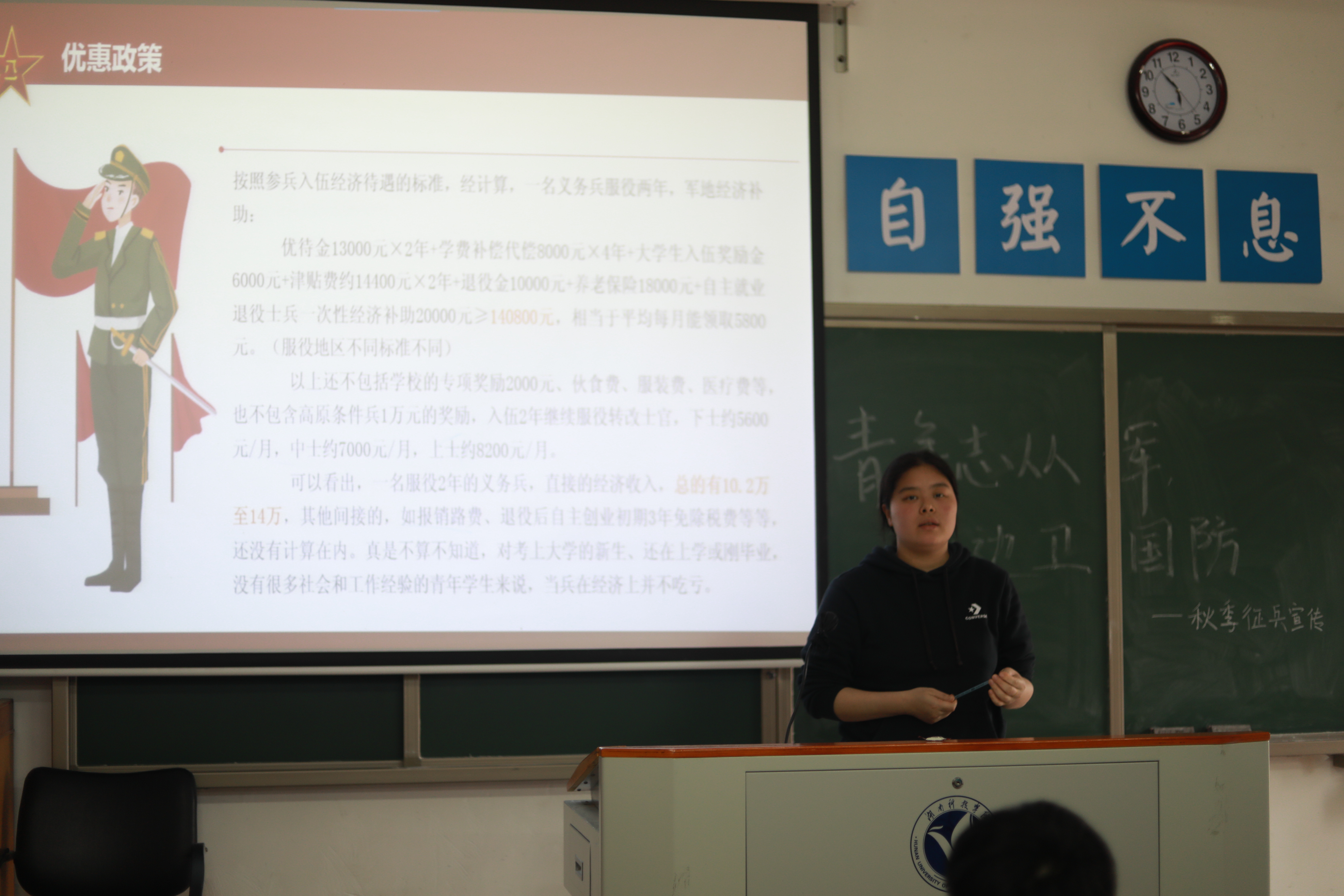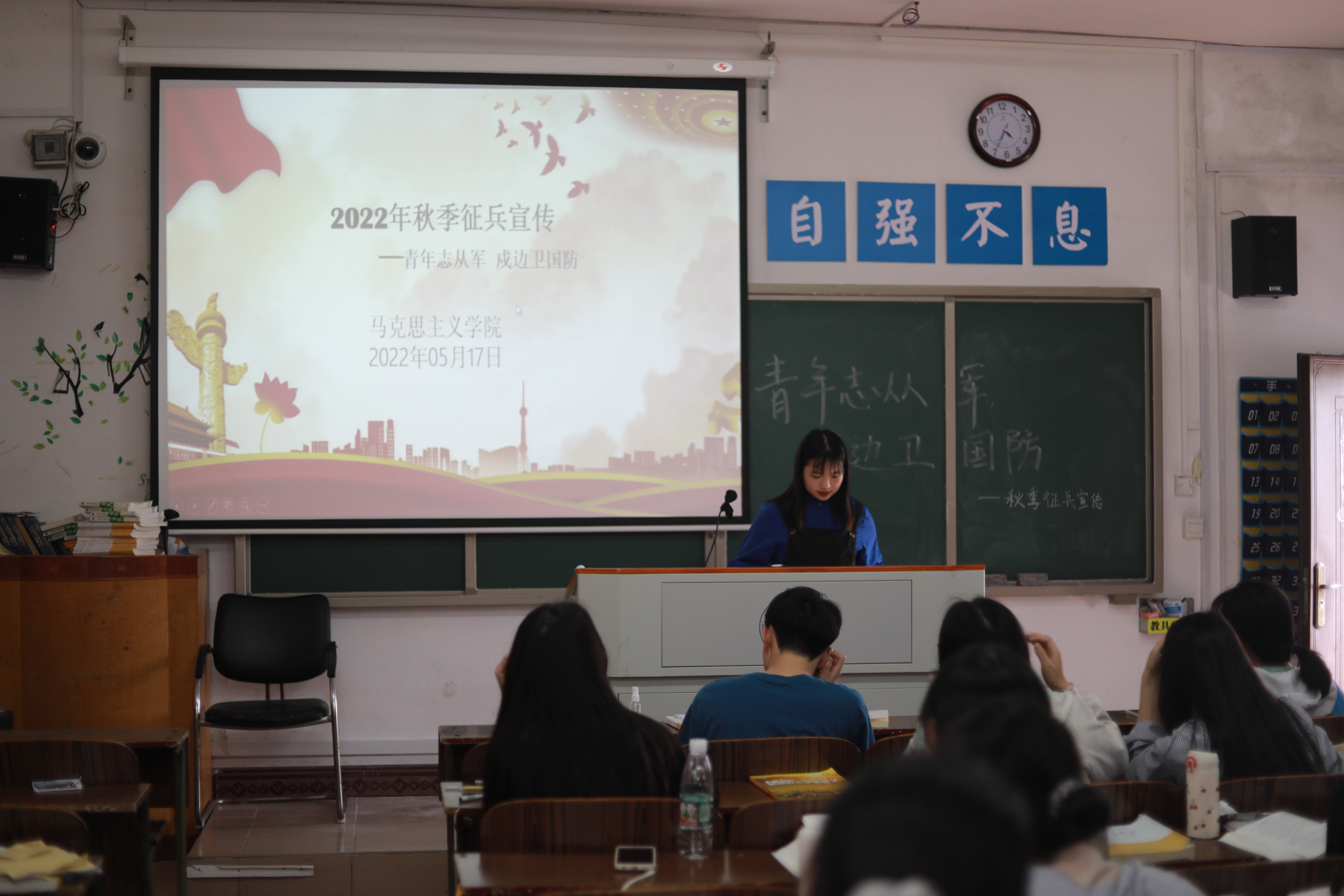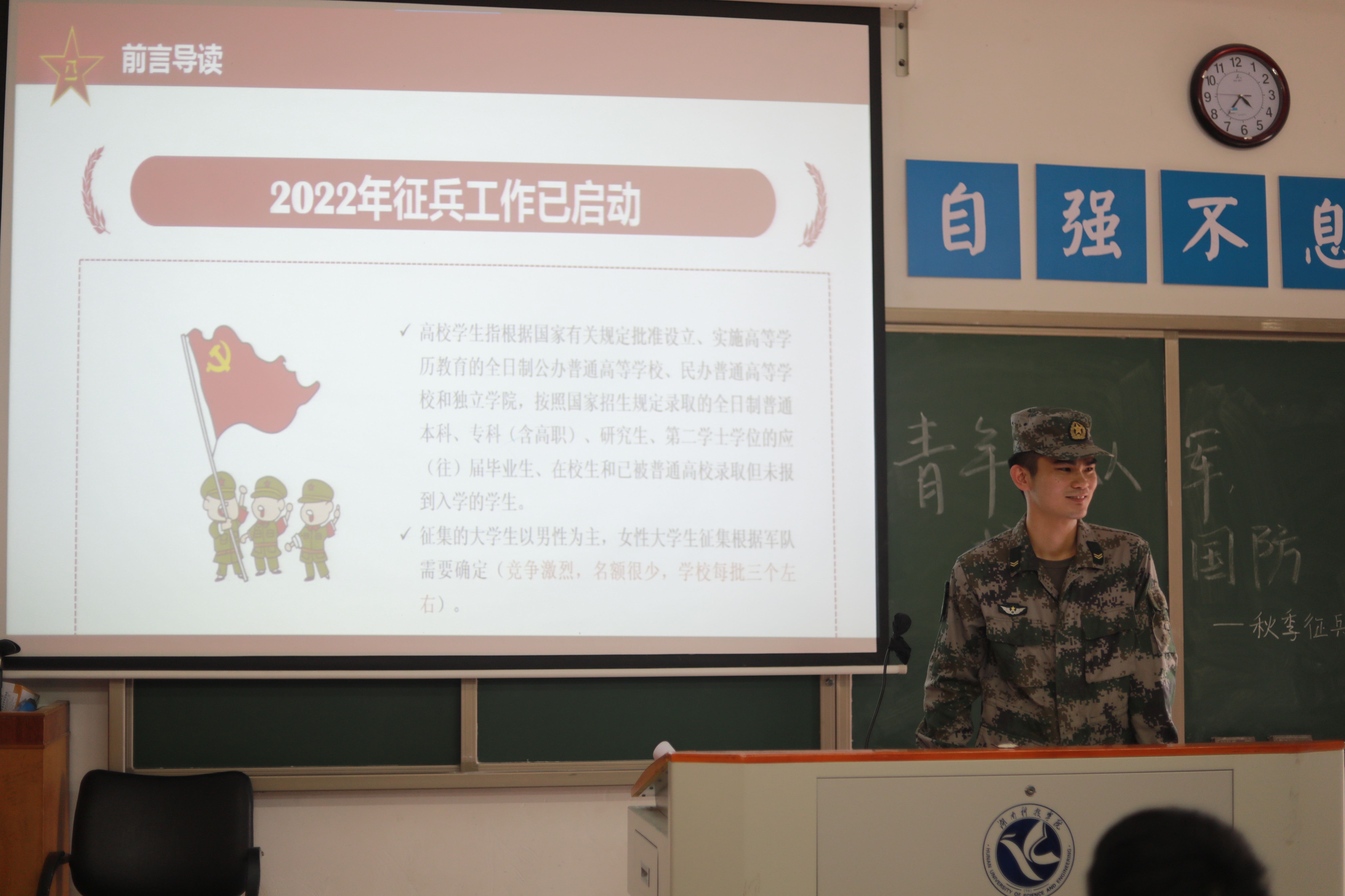 本网讯(记者 李金)为深入贯彻落实习近平新时代中国特色社会主义思想和习近平强军思想,鼓励大学生圆梦军营,切实做好我校2022年度秋季征兵工作,5月17日,马克思主义学院特此于鹤鸣楼501教室举行“青年志从军,戍边卫国防”交流分享会活动,全体21级学生参加,思政1902班付雄担任主讲分享人,团总支书记胡非进行相关补充讲解。