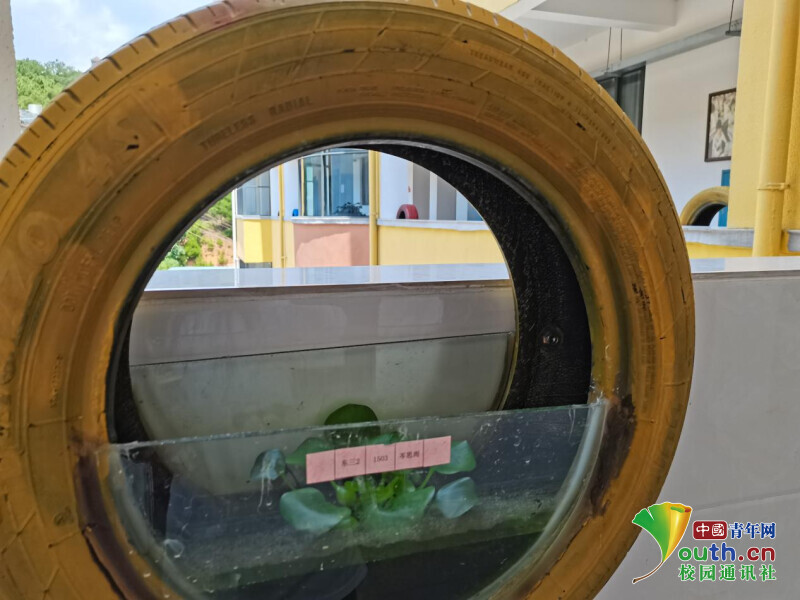 在为人小学老师们的带领下,实践团成员们来到了为人楼。实践团成员们发现为人楼的走廊上有许多用轮胎做的“物件”,看出她们的好奇为人小学的老师告诉她们这是一个鱼缸,同学们一人负责一个,培养同学们的爱心与责任心,由于现在放假了,同学们都回家了,鱼缸里就没水了。