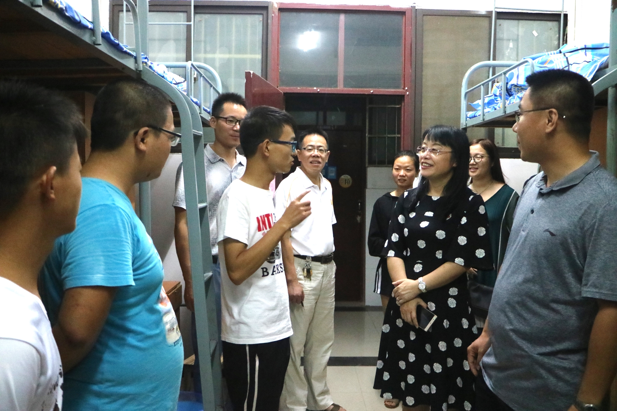 本网讯(通讯员 贺茶湘)9月16日晚上,迎新工作结束后,我院廖雅琴院长、杨军副院长、党总支副书记兼副院长李观求和学工办主任兼辅导员全伟来到新生宿舍,看望顺利报到、入住宿舍的新同学。