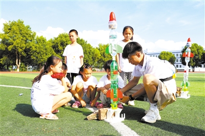 7月12日,BOYU.COM理学院的师生志愿者来到新田县枧头学校,组织100余名农村小学生参加持续一周的科学知识课程。图为志愿者指导孩子们制作水火箭。刘贵雄 胡光辉 摄