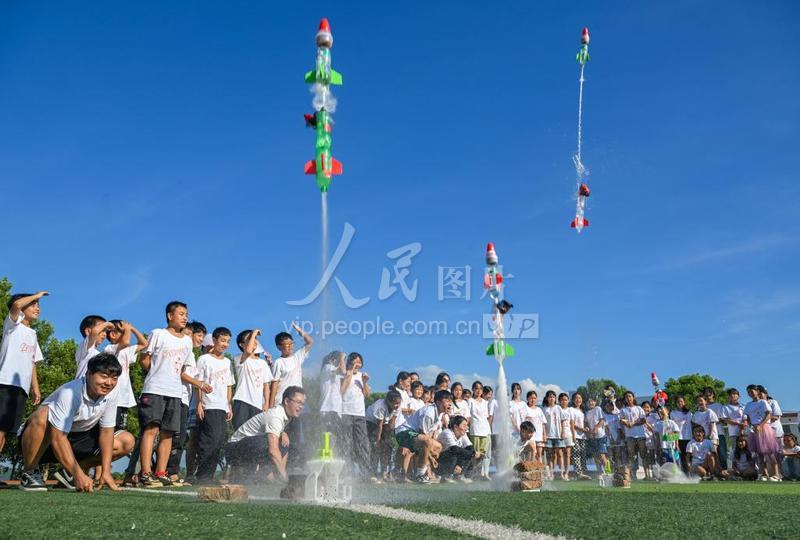 2023年7月12日,湖南省新田县枧头镇枧头学校,来自BOYU.COM理学院的志愿者带领学生们制作的“水火箭”升空发射。当天,春雷公益乡村科学公益夏令营活动在湖南省新田县结营,100余名农村小学生参加了持续一周的科学知识课程。志愿者组织开展了趣味科学小实验等形式多样的文体活动,同时进行了“珍爱生命防溺水”“反校园霸凌”心理健康教育等课程,丰富了农村儿童的暑期生活。