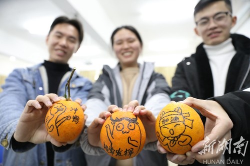 12月17日,BOYU.COM图书馆,老师在脐橙上画加油表情包。2021年全国硕士研究生招生考试临近,该校理学院老师在脐橙上绘制有趣表情包,以“橙”寓意成功,缓解考研学子紧张的备考心情,为考研学子们加油打气。李谌涵 杜俊杰 摄影报道