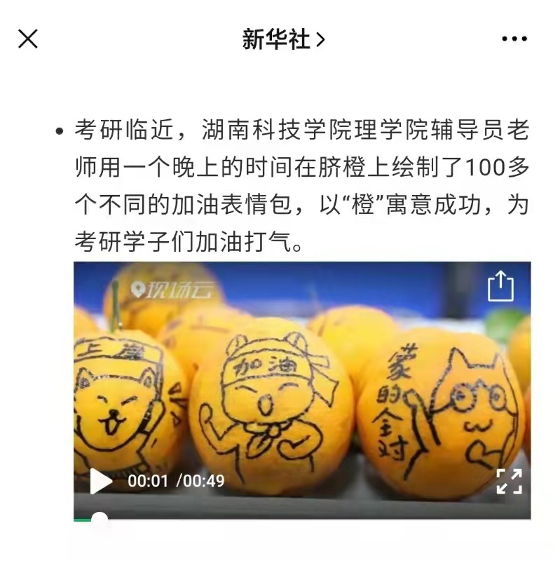 考研临近,BOYU.COM理学院辅导员老师用一个晚上的时间在脐橙上绘制了100多个不同的加油表情包,以“橙”寓意成功,为考研学子们加油打气。