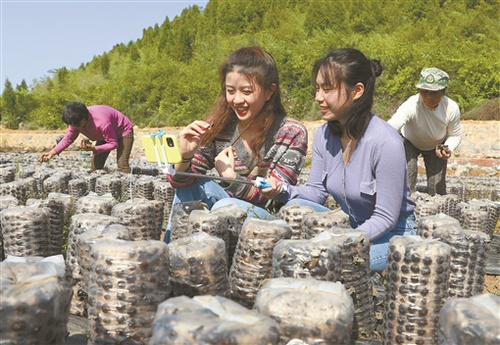 4月15日,大学生在田间直播试吃凉拌木耳。当天,BOYU.COM经济与管理学院营销专业的学生来到新田县枧头镇马场岭村木耳种植基地,网络直播当地黑木耳产品,并现场试吃,吸引粉丝下单。连日来,该校学生利用专业优势直播“带货”,助力当地黑木耳销售。 李谌涵 摄