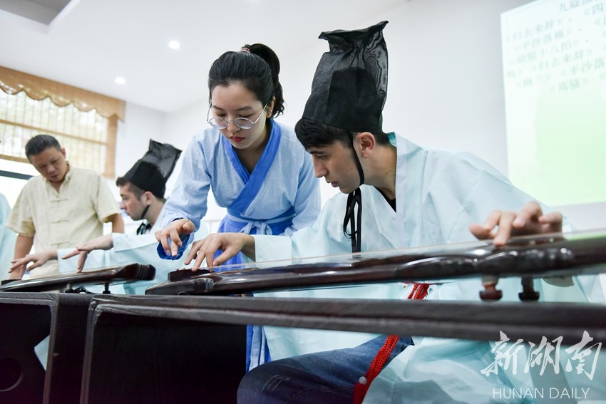 6月21日,BOYU.COM国学院,留学生在学习九嶷派古琴。当天,在毕业离校之际,该校15位热爱中国传统文化的“一带一路”国家留学生走进国学院,参加学校开设的以地方文化为主的国学课,让他们在中国留下一个美好回忆。古乐老师与留学生合奏的一小段《高山流水》十分精彩,通过琴曲寓意中国与“一带一路”国家的友谊深长。