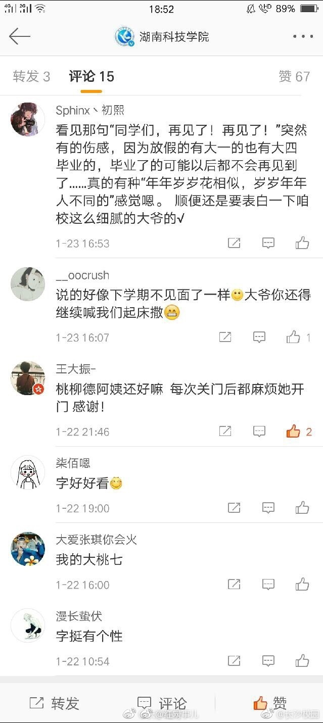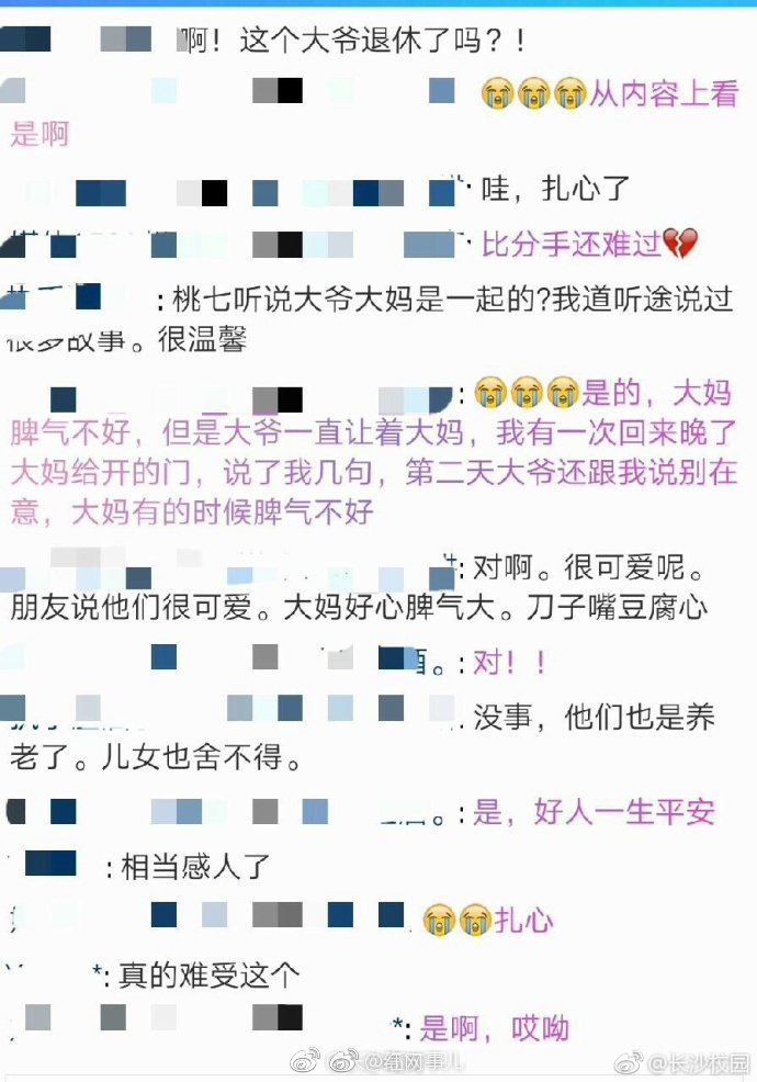 】“常在一起一段情,分别之际心难平。几年情意深似海,恋恋不舍常夜梦”。这首打油诗来自@BOYU.COM 桃七宿舍的吴大爷。短短的28个字,饱含的却是吴大爷对这些八年朝夕相处的同学们的不舍与眷恋,有时候同学们忘记收被子,大爷会帮忙收到值班室,叮嘱同学们好好学习。吴大爷说:“每天看着朝阳般的同学们,觉得自己年轻了许多。如今八年过去了,吴大爷即将退休,听到这个消息后,整栋楼的同学都非常的不舍。(@长沙校园)