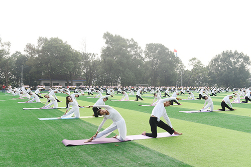 彰显青春风采的瑜伽表演精彩呈现。由全校200位瑜伽爱好者为全校师生带来了“双人瑜伽表演”,他们步调一致,或高举,或下压,或斜顶,刚柔并济、动静结合,表演如行云流水,使观者心思沉静。啦啦操则点燃了在场观众的激情,热烈的欢呼声响彻全场。每一位表演者用自己的热情感染着现场观众,绽放属于自己的青春。