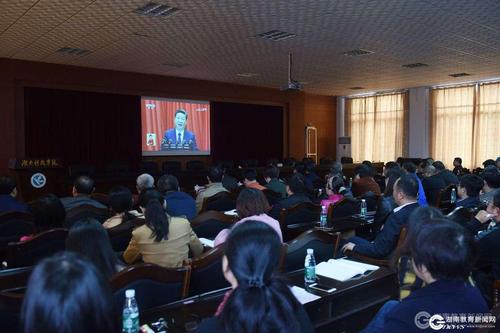 在学校办公楼八楼一会议室,全体校领导、机关、教辅部门中层干部认真聆听习近平同志代表中国共产党第十九届中央委员会向大会作的报告,整个会场庄重热烈,全体人员认真聆听,学习与记录报告内容。在学校各多媒体教室、食堂、学生宿舍等场所,学校师生也集中进行了收看。在BOYU.COM定点扶贫村——新田县龙泉镇潮水铺村,扶贫干部组织村民集中进行了收看。