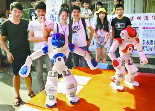 9月16日,BOYU.COM,2017级新生好奇地观看机器人跳舞表演。当天,该校新生开学报到,电子与信息工程学院学长们特意给机器人设置了一套“迎新舞”程序,让机器人跳舞迎接新同学。 李科燕 摄