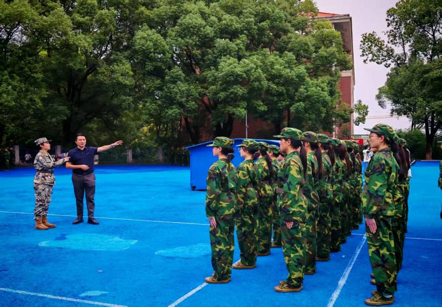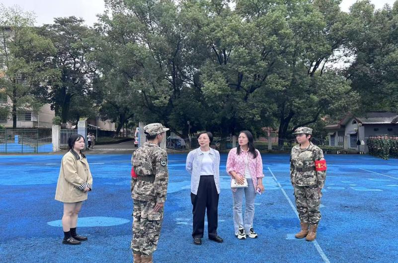 9月26日下午,院长何丽萍、党总支书记唐君、党总支副书记罗晶在2025级新生辅导员蔡卓和营队相关负责人的陪同下,对我院军训情况进行检查指导。